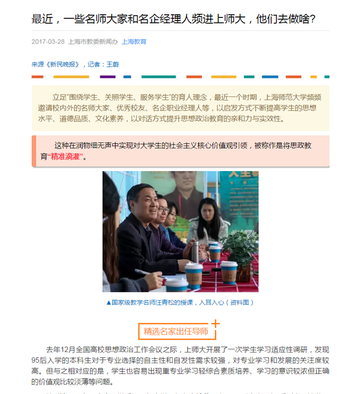 我校认真贯彻落实全国高校思想政治工作会议精神,立足“围绕学生、关照学生、服务学生”的育人理念,创新思想政治教育模式,变“大水漫灌”为“精准滴灌”。在全校范围内开设了“人生导师”系列专题沙龙,聘请一批经过精心选择的学术造诣高深、教学能力优异、工作业绩突出的名家或“大咖”组成“人生导师”队伍,他们中有国家级教学名师、优秀校友和知名企业职业经理人、中小学特级校长和特级教师等。全校在读学生打破学院、系科和专业的界限,在“上师学工在线”公众微信平台上自主选择、自主报名、自主参加。人生导师们采用小范围的专题沙龙形式授课,每次沙龙只有15个名额,名额一经发布就被“秒杀”。目前,人生导师专题沙龙已在校院两级层面开设38期,在关注学生个性化和精细化指导的同时,积极推进构建全员育人、全过程育人、全方位育人的思想政治教育大格局。近日,新民晚报、“上海教育”微信公众号先后报道我校“精准滴灌”的思政教育创新模式。