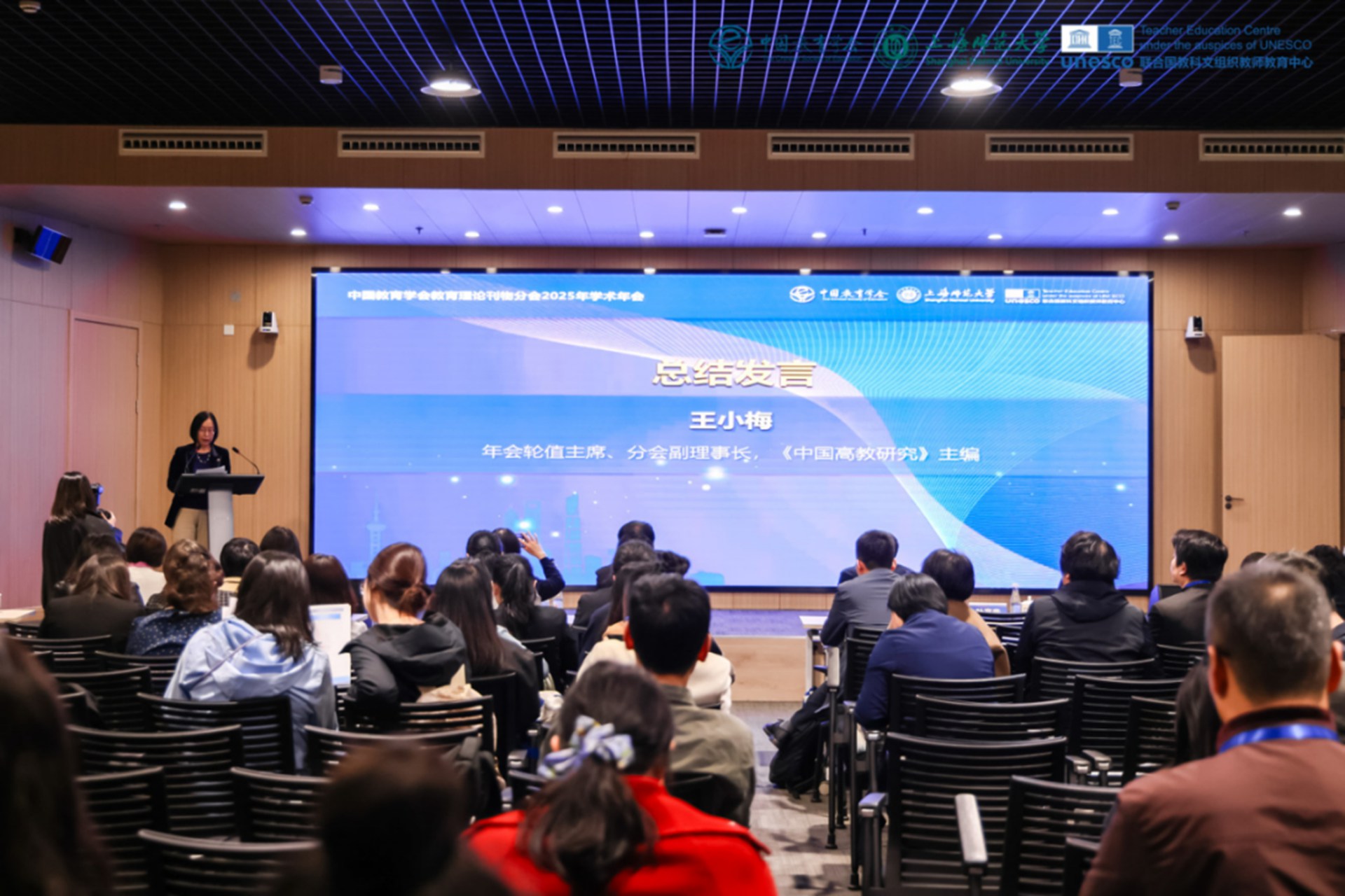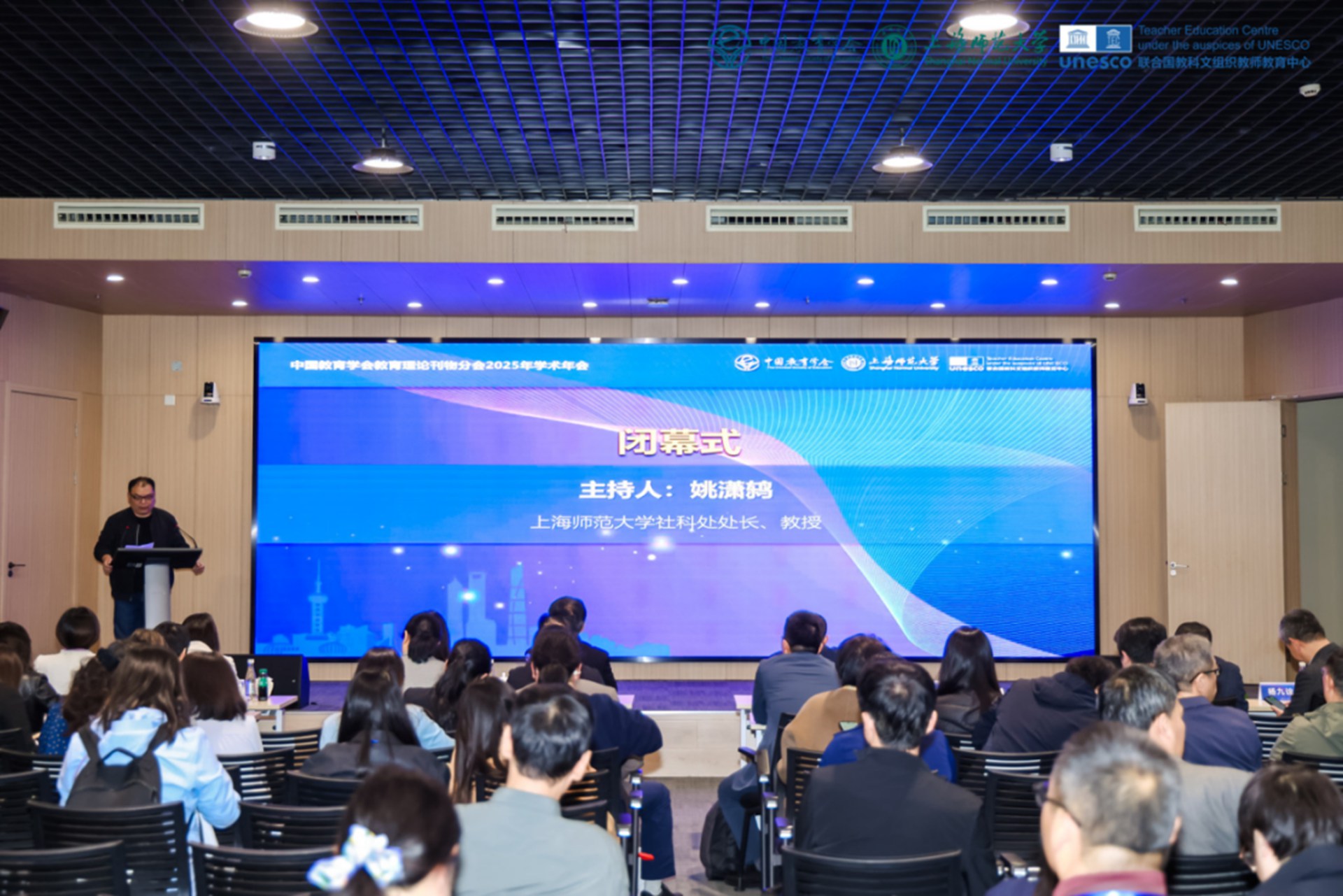 闭幕式由上海师范大学社科处处长姚潇鸫教授主持。杭州师范大学副教授李阳杰、《班主任之友》副社长张炜、《高等教育研究》编辑部主任许宏、《贵州大学学报》编辑部副编审郭芸分别作为小组代表进行发言。《宁波大学学报(教育科学版)》副主编焦岚作为下一届年会承办方代表作了表态发言,邀请各位参会代表于2026年相聚宁波。