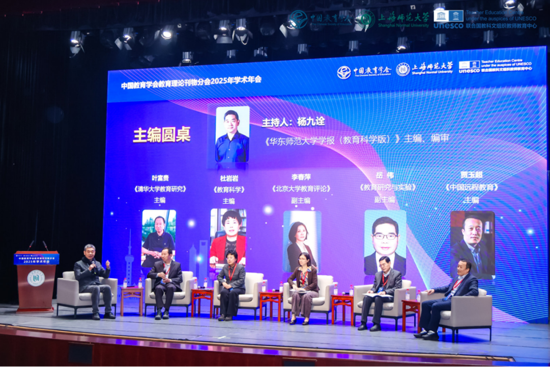 主编圆桌环节由《华东师范大学学报(教育科学版)》主编杨九诠主持,《清华大学教育研究》主编叶富贵、《教育科学》主编杜岩岩、《北京大学教育评论》副主编李春萍、《教育研究与实验》副主编岳伟、《中国远程教育》主编贾玉超围绕“教育强国视域下的知识生产”展开了深度对话。五位主编分别从供需对接、学理把关、问题导向、智能适配、理论创新等维度展开,提出期刊应对接知识供需、以学理性为论文的学术通行证、聚焦智能时代新议题和真问题、立足概念创新与突破文献综述局限等核心观点。杨九诠主编强调,《教育强国建设规划纲要(2024—2035 年)》明确提出要打造数字教育权威期刊,打造具有国际影响力的学术期刊,由此可见,推动并参与知识生产不仅是教育理论刊物的核心使命,更是其不可推卸的固有职责。