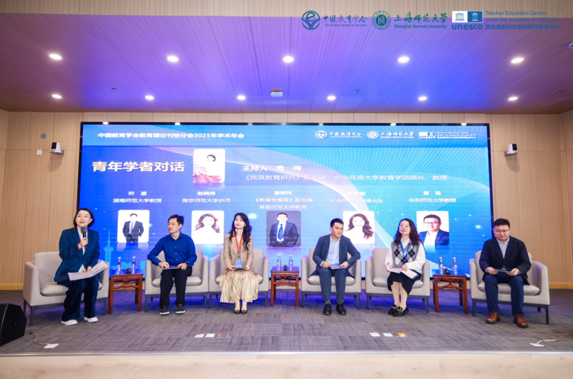 青年圆桌对话环节由《民族教育研究》副主编、中央民族大学教育学院院长袁梅主持。湖南师范大学教授叶波、南京师范大学讲师赵晓伟、首都师范大学教授康晓伟、北京师范大学博士生韩梦莹、华东师范大学教授雷浩五位青年学者围绕多个核心议题分享见解。在“教育学本土标识性概念生产”议题中,叶波教授提出,青年学者需平衡“本土立场”与“全球视野”,从中国教育实践中提炼原创概念;在“学术发表与学者成长生态”讨论中,雷浩教授结合自身经验强调团队协作与问题意识的重要性,康晓伟教授则从期刊编辑视角建议青年学者深耕研究领域,坚守学术初心;赵晓伟、韩梦莹两位学者针对“人机协同知识生产”与“学术伦理风险”话题,提出要坚守人类主体性、防范技术依赖,建立AI使用规范与审核机制,对青年学者学术成长与智能时代知识生产进行探讨。