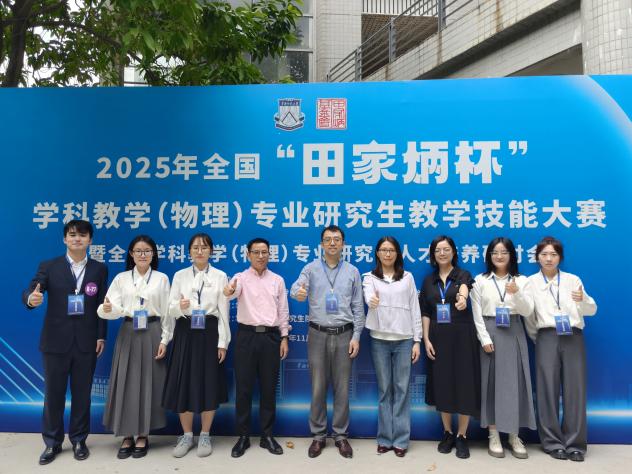 11月6日至9日,全国“田家炳杯”全日制教育硕士专业学位研究生学科教学(物理)专业教学技能大赛决赛在华南师范大学成功举办,来自全国78所高校的199名优秀选手进入决赛同台竞技。由院长刘锋、副院长林方婷,专业教师方伟、岳晓婷带队参赛,在备赛过程中,指导教师团队围绕教学设计、课堂展示等核心环节,为参赛学生提供系统训练与个性化指导;参赛学生刻苦钻研、反复打磨,不断优化教学方案与展示细节。经过多轮激烈角逐,杨飞扬凭借出色表现荣获全国一等奖,闫梦瑶、何玮获全国二等奖,金子昂、尹思源获全国三等奖,秦晓梅、胡志娟、方伟三位老师获得优秀指导教师荣誉称号。