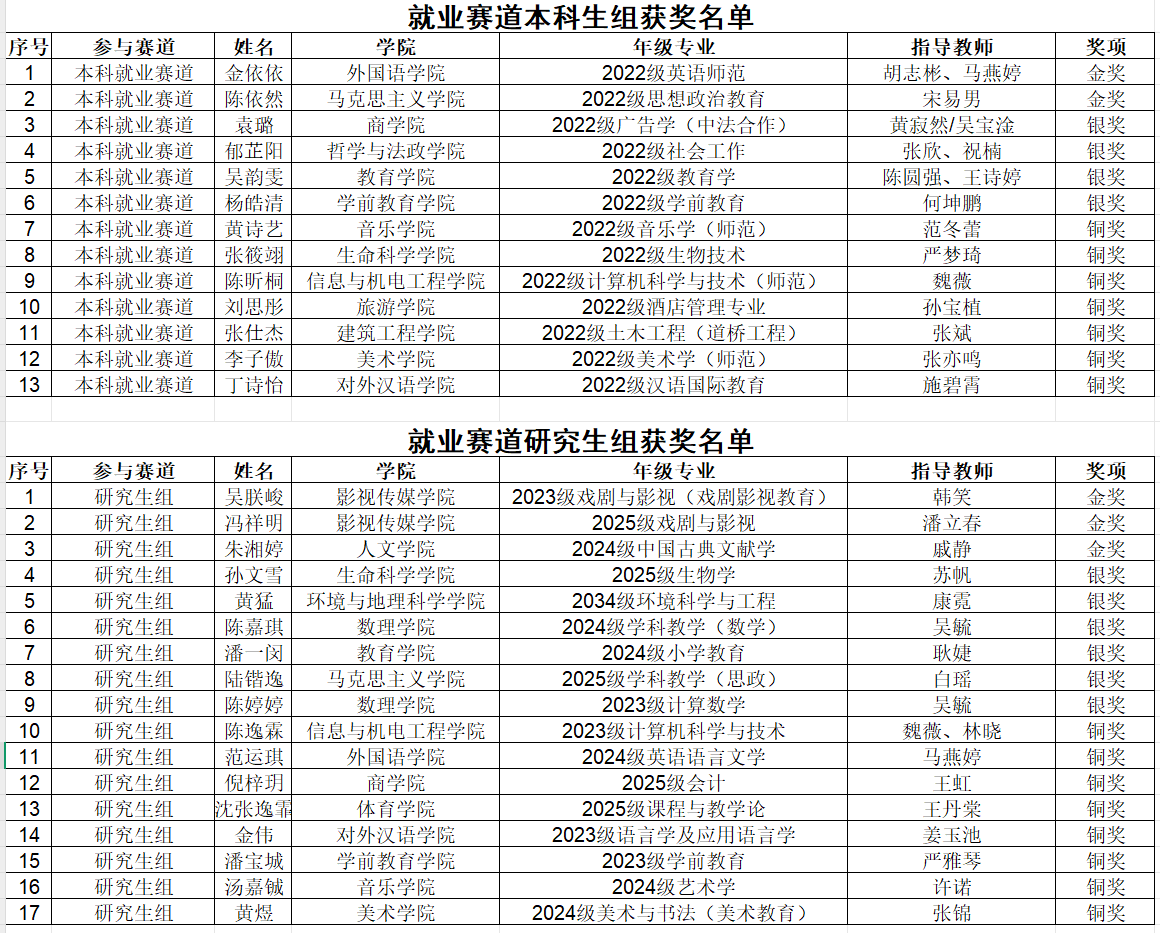 经过激烈角逐,本科生就业赛道组评选出金奖2人,银奖4人,铜奖7人。研究生就业赛道组评选出金奖3人,银奖6人,铜奖8人。