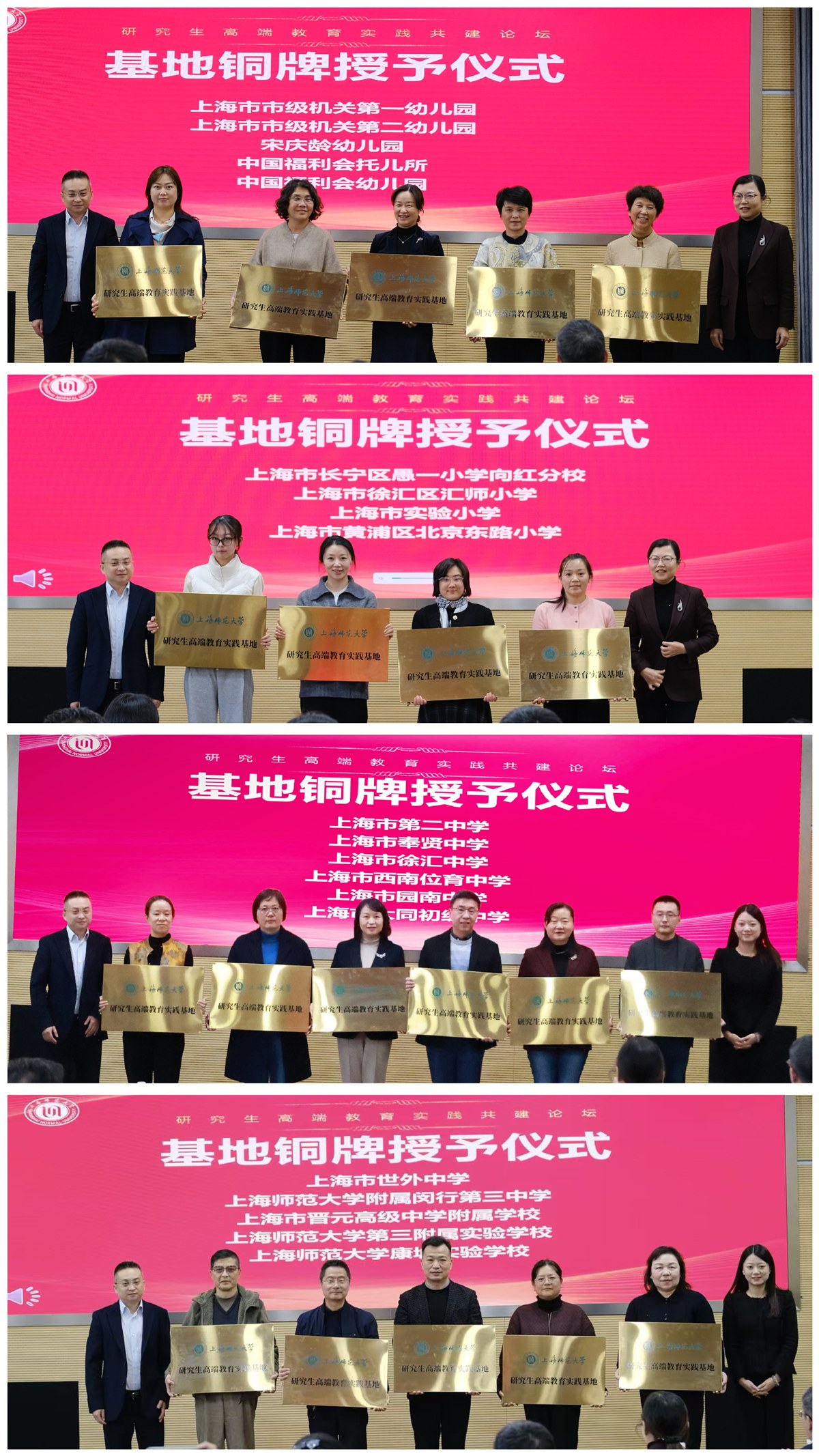 在授牌仪式环节,研究生院常务副院长张昉、基础教育处副处长李晓芳、发展规划处副处长沈希希共同为20所基地学校授牌。