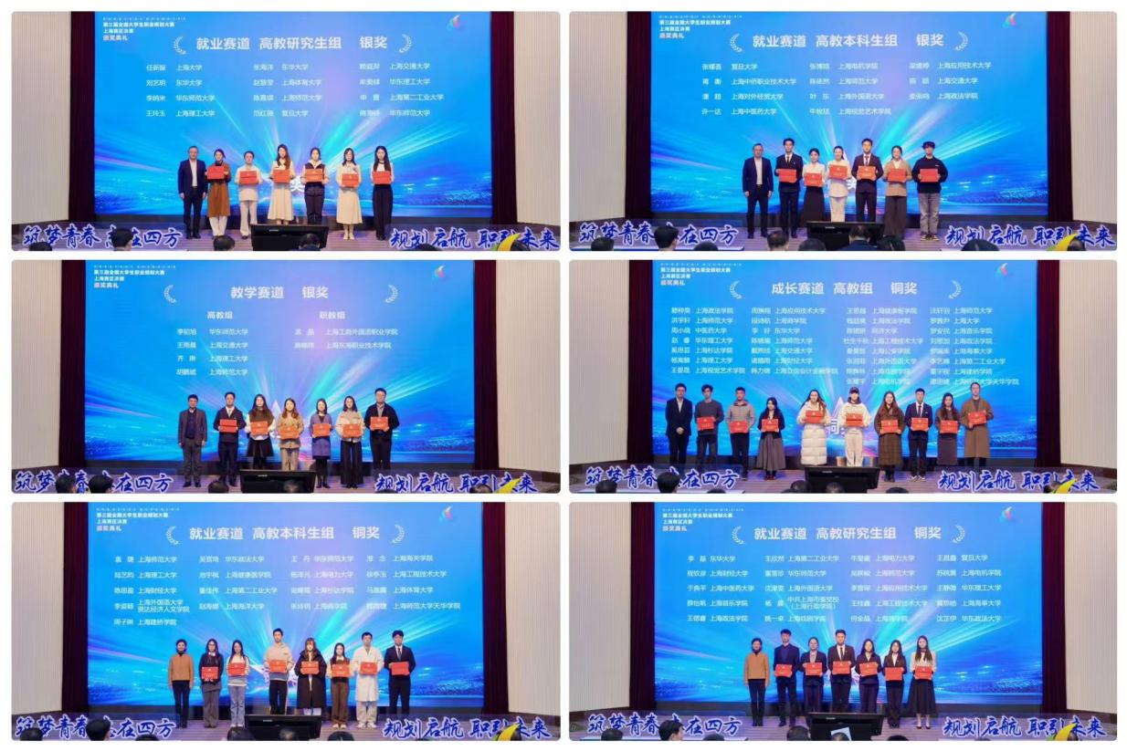 本次市赛设有成长赛道、就业赛道(研究生组与本科生组)以及课程教学赛道,全面覆盖不同学段学生以及生涯教育与就业指导课程授课教师。经过校级选拔、市级复赛与决赛的激烈角逐,我校参赛选手表现优异,在多个赛道中斩获佳绩,累计获得银奖3项,铜奖5项。
