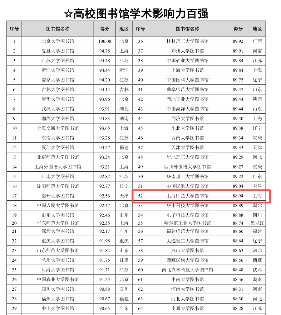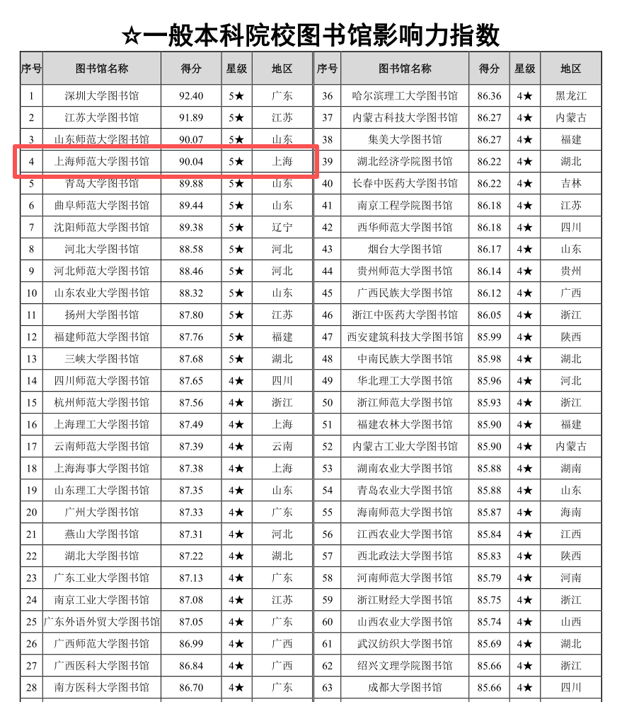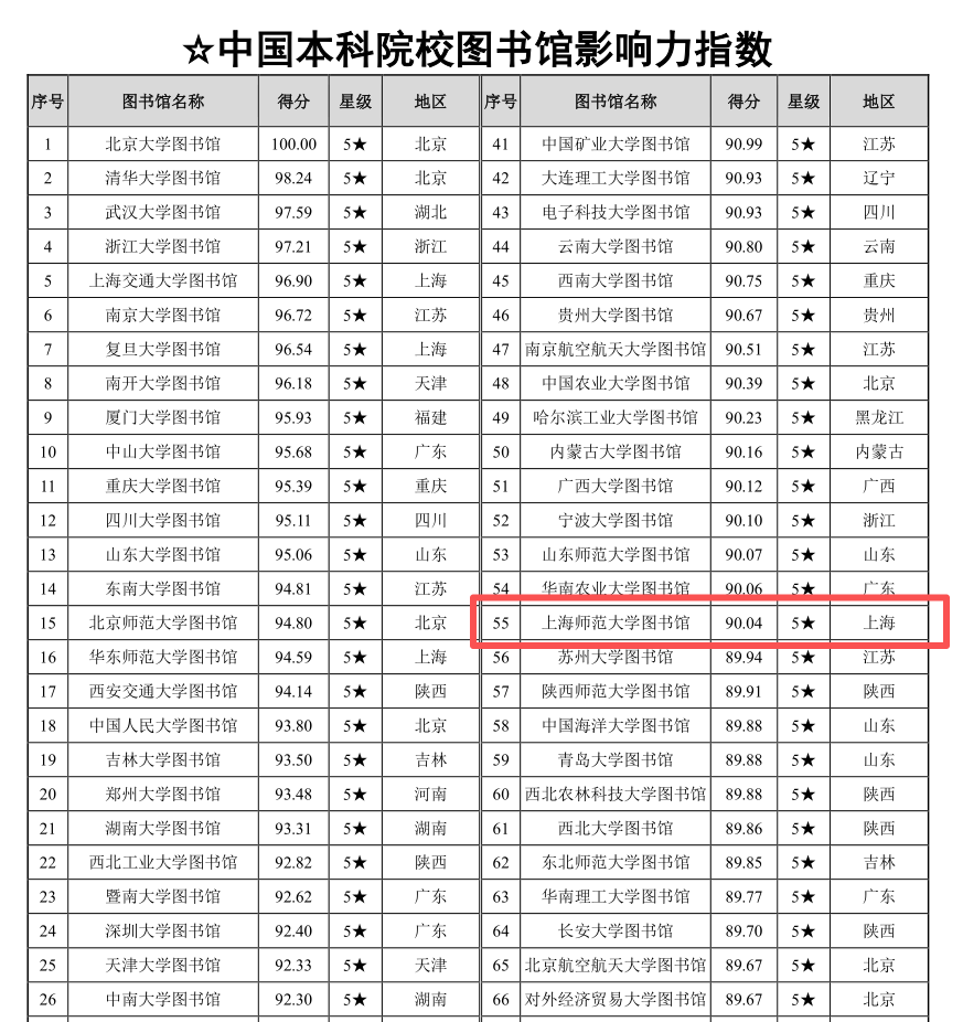 近日,“数智时代中国图书馆影响力指数报告(2025)”正式发布。我校图书馆在该报告各项指数排行榜中,均上榜百强。“中国本科院校图书馆影响力指数”排行榜中,评分90.04分,位列中国本科院校图书馆影响力总排行榜第55名,上海地区第7名,蝉联五星图书馆。在“一般本科院校图书馆影响力指数”排行榜中,位列第4名。在“高校图书馆学术影响力百强”排行榜中,评分88.94,位列第52名。