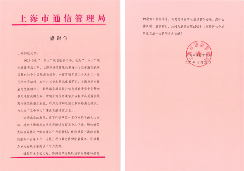 上海市通信管理局近日专门致函学校,对我校分析测试与超算中心在推进“算力浦江”行动计划、组织建设上海教育智算服务平台等方面给予的大力支持表示衷心感谢。信函充分肯定了学校为提升全市算力资源配置效率、促进区域算力协同发展所作出的积极贡献。