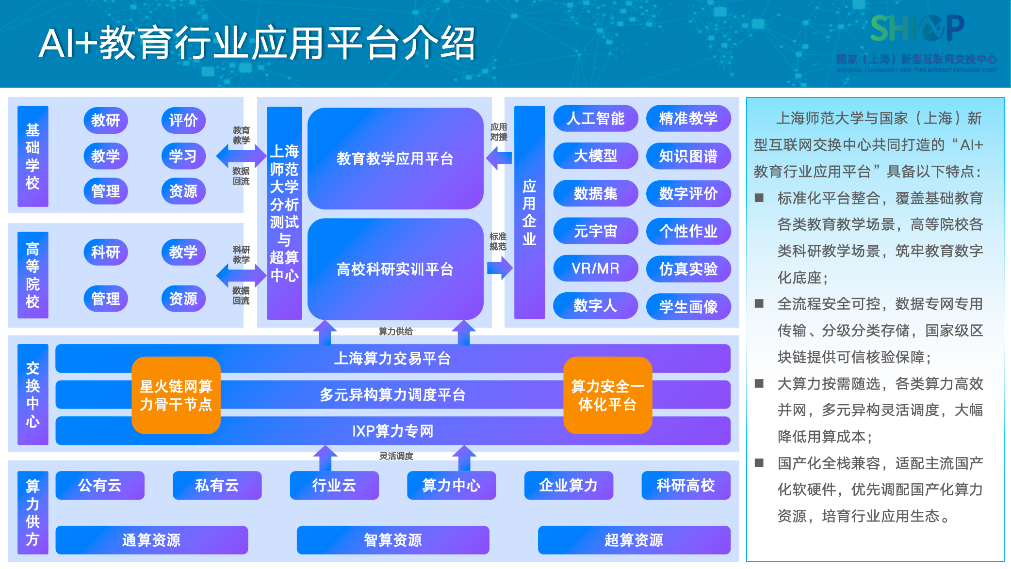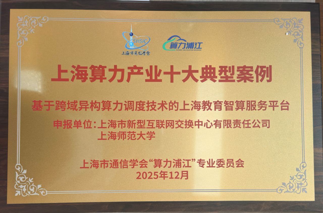 近日,上海市通信学会“算力浦江”专业委员会公布了2025年上海算力产业典型案例评选结果,我校联合国家(上海)新型互联网交换中心(以下简称“SHIXP”)建设的“上海教育智算服务平台”(以下简称“平台”)从众多参选案例中脱颖而出,成功入选“2025年上海算力产业十大典型案例”。这一荣誉不仅是对学校在算力基础设施建设方面取得成就的肯定,更是对学校教育数字化转型工作的充分认可。