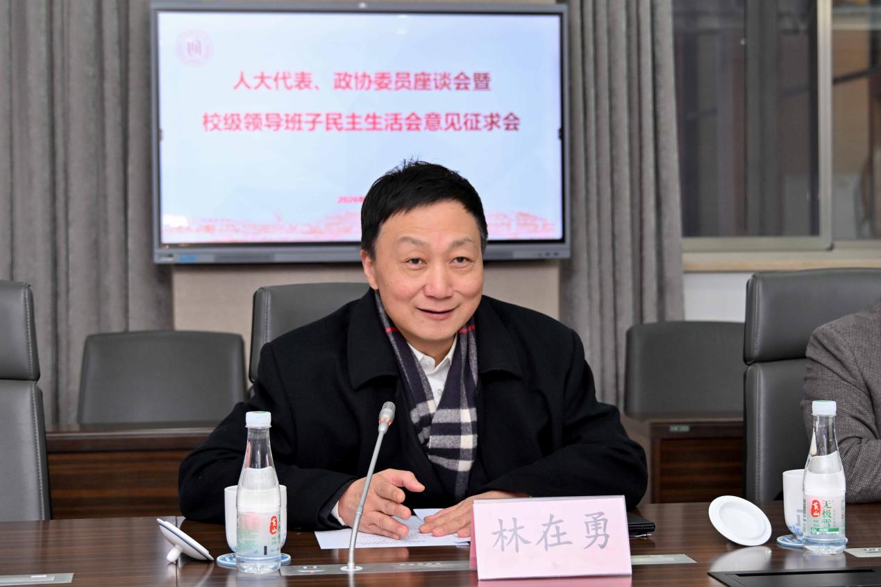1月7日下午,学校在外宾楼101会议室,召开人大代表、政协委员座谈会暨校级领导班子民主生活会意见征求会。校党委书记林在勇出席会议并讲话。学校市、区两级人大代表、政协委员,校党委组织部、统战部相关负责同志参加会议。校党委副书记吴沛东主持会议。