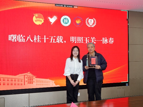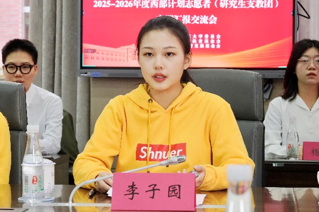 第27届研究生支教团甘肃分队队长李子园、广西分队队长王瑞分别就支教团半年以来的教学活动、爱心助学、特色校园活动等相关情况进行了汇报。支教团成员履行教学职责,积极开发特色社团与精品课程,关心同学开展各类家访,践行支教的初心与使命。上海退役军人学院2024级研究生、服务于新疆生产建设兵团的殷倩雯,作为西部计划志愿者代表进行工作汇报。我校12名志愿者在新疆、西藏、贵州、云南等地办实事、解民忧,用点滴行动为当地乡村振兴积蓄赋能,为基层治理提质增效,共同凝聚起建设西部的青春合力。