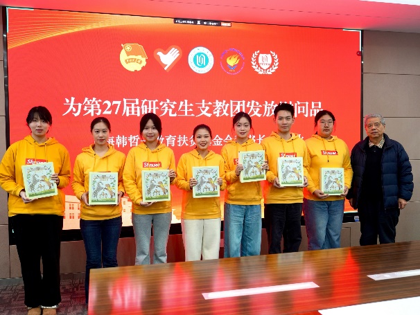 韩烽火为第27届研究生支教团发放慰问品。全体支教团成员也为上海韩哲一教育扶贫基金会送上了一份礼物,致敬十五年来“曙明计划”的倾情帮扶与暖心相伴。