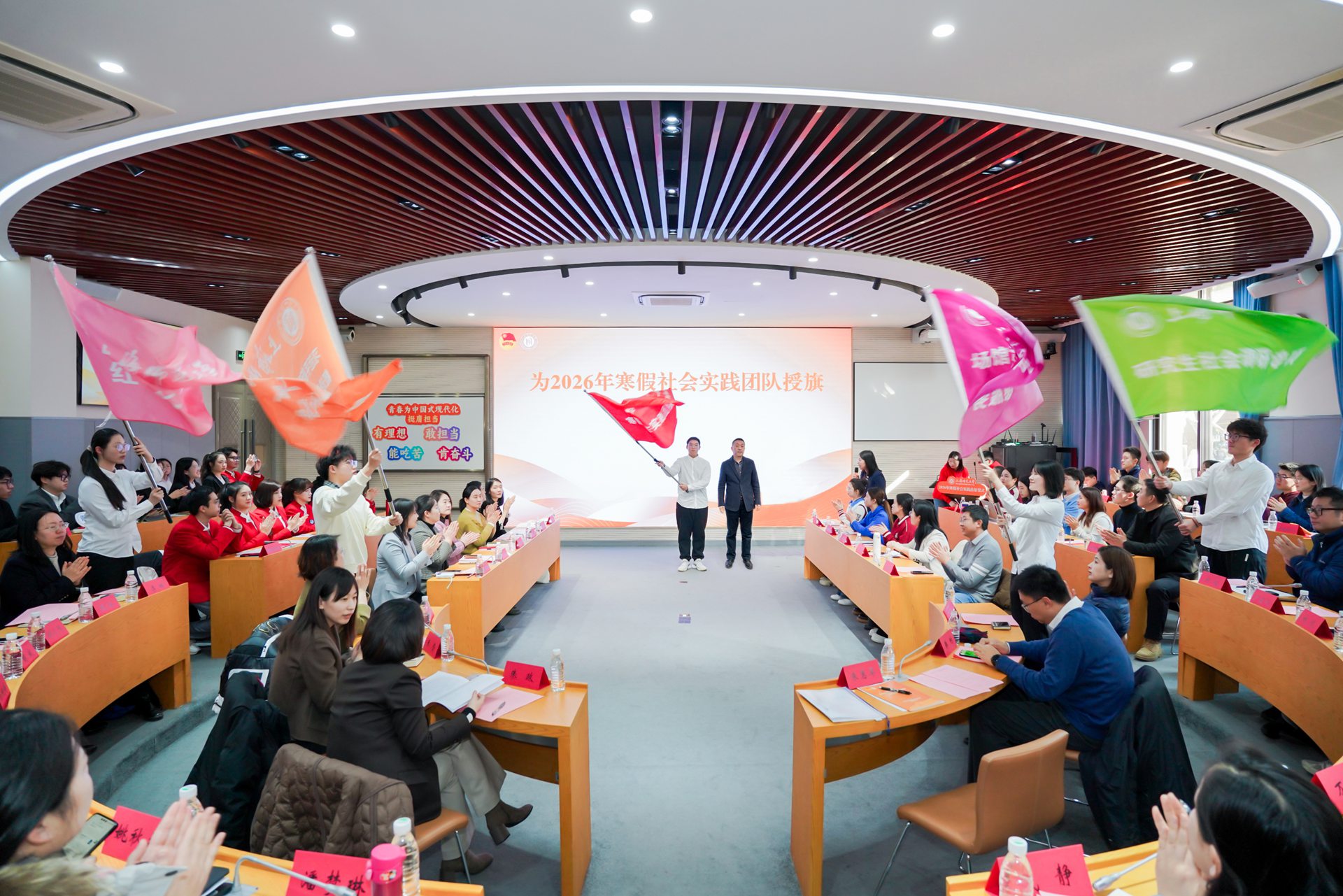 朱惠军为2026年寒假社会实践团队授旗并作动员讲话。他在讲话中强调要在心怀“国之大者”中坚定政治自觉,坚持不懈用习近平新时代中国特色社会主义思想铸魂育人;在体察世情国情中增强思想自觉,主动融入和服务上海“五个中心”建设;在投身中国式现代化新征程中激发行动自觉,推动社会实践活动内涵化、规范化、常态化、长效化发展。他勉励师大青年心中有梦,眼里有光,脚下有路,在社会实践的广阔天地中锤炼过硬本领、涵养责任担当,共同迎接“十五五”更加壮阔的发展前景,奋力谱写中国式现代化建设的崭新篇章!