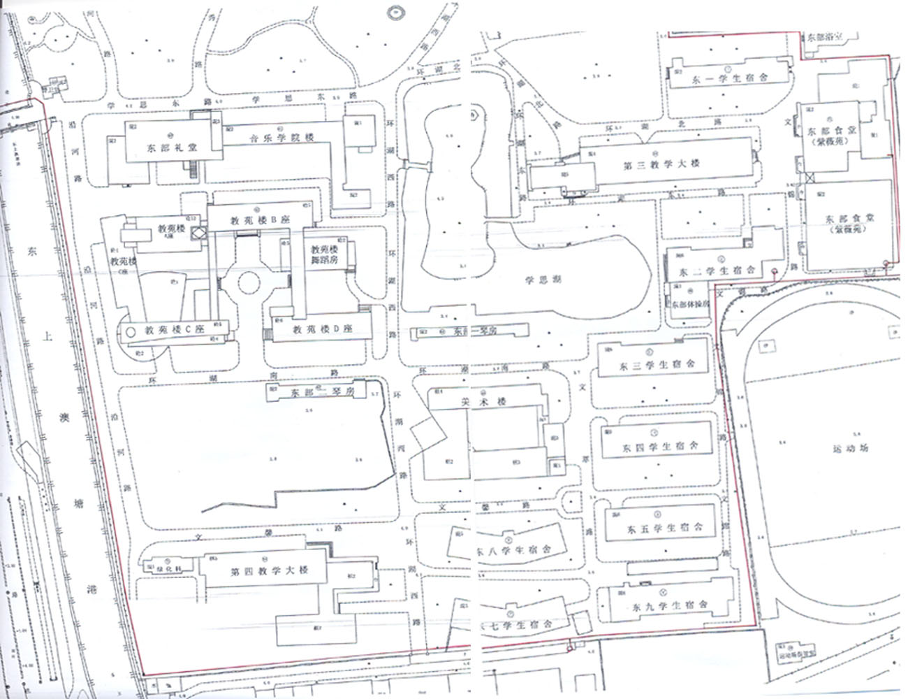 二、管道走向:废除原穿行校园主干道的煤气管道,改沿校园围墙和东部体育场旁绿化带至东部食堂供气点,再沿东一宿舍后围墙与文馨苑天然气管道连通(详见附图中的红线)。