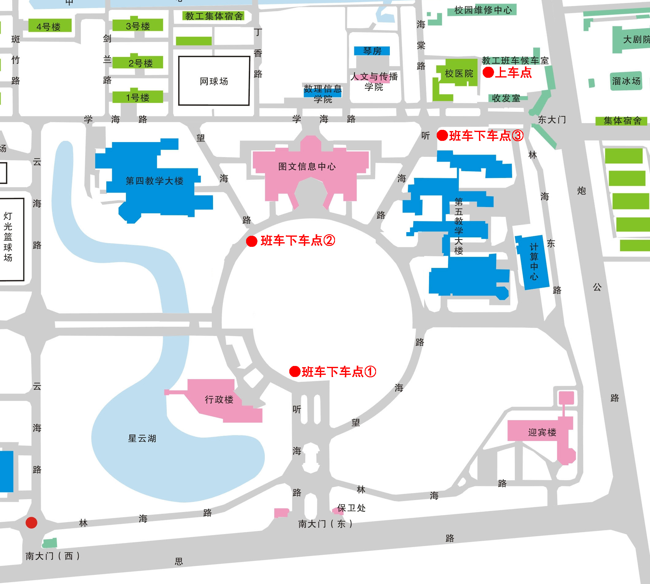 一、教职工班车奉贤校区内下车站点依次为①行政楼、②图文信息中心西南侧、③学海路听海路口,详见下方示意图: