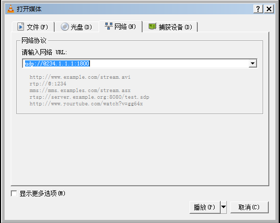 3.在“打开媒体”对话框中“网络协议”内容中输入“udp://@234.1.1.1:1800”,然后按“播放(P)” 按钮(如图)。