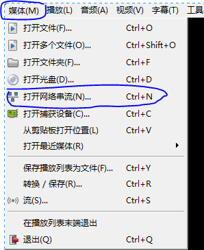 2.启动VLC媒体播放器,在“媒体(M)”菜单中选择“打开网络串流(N)”项(如图)