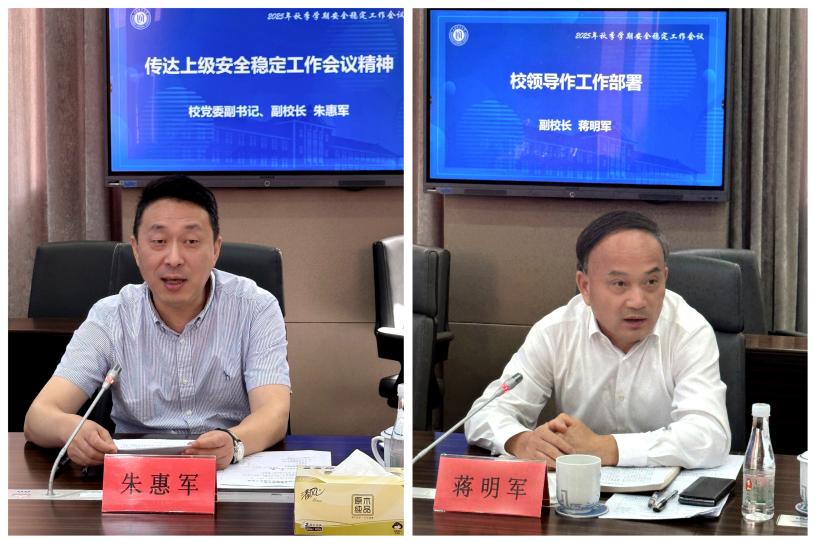 9月26日下午,学校召开2025年秋季学期安全稳定工作会议,传达上级有关会议精神,分析研判当前校园安全面临的风险挑战,安排部署新学期校园安全稳定重点工作。校党委副书记、副校长朱惠军,副校长蒋明军,相关职能部门、学院负责人参加会议并进行工作交流。会议由朱惠军主持。