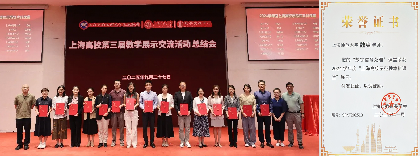 在此次评选中,我校喜获多项荣誉。信息与机电学院魏爽副教授主讲的《数字信号处理》课程,荣获2024学年度“上海高校示范性本科课堂”称号。同时,教育学院杨伊副教授在2024年度“上海高校教师教学能力提升试点班”学习中表现突出,获评“结项优秀教师”。魏爽副教授还凭借其丰富的教学经验和专业水平,获聘为教学指导专家。