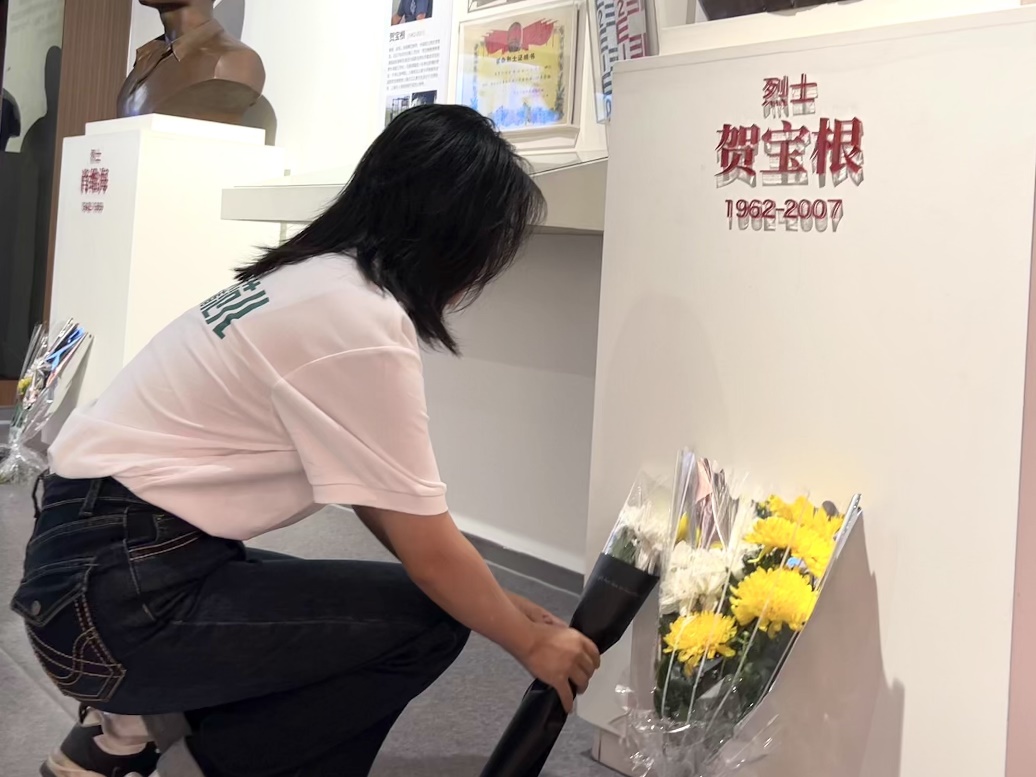 在讲解员的深情讲述中,支教团成员的思绪被带回英烈们奋斗的岁月:贺宝根数十年扎根教育沃土,以“三尺讲台育桃李,一片丹心铸民魂”的坚守,诠释了人民教师的使命担当;肖维海在危急时刻挺身而出,以“勇献青春酬壮志,一腔热血洒练江”的壮举,用年轻的生命践行了青年的家国情怀。每一段事迹都让在场的成员深刻感受到英烈精神中蕴含的初心力量与信仰光芒。