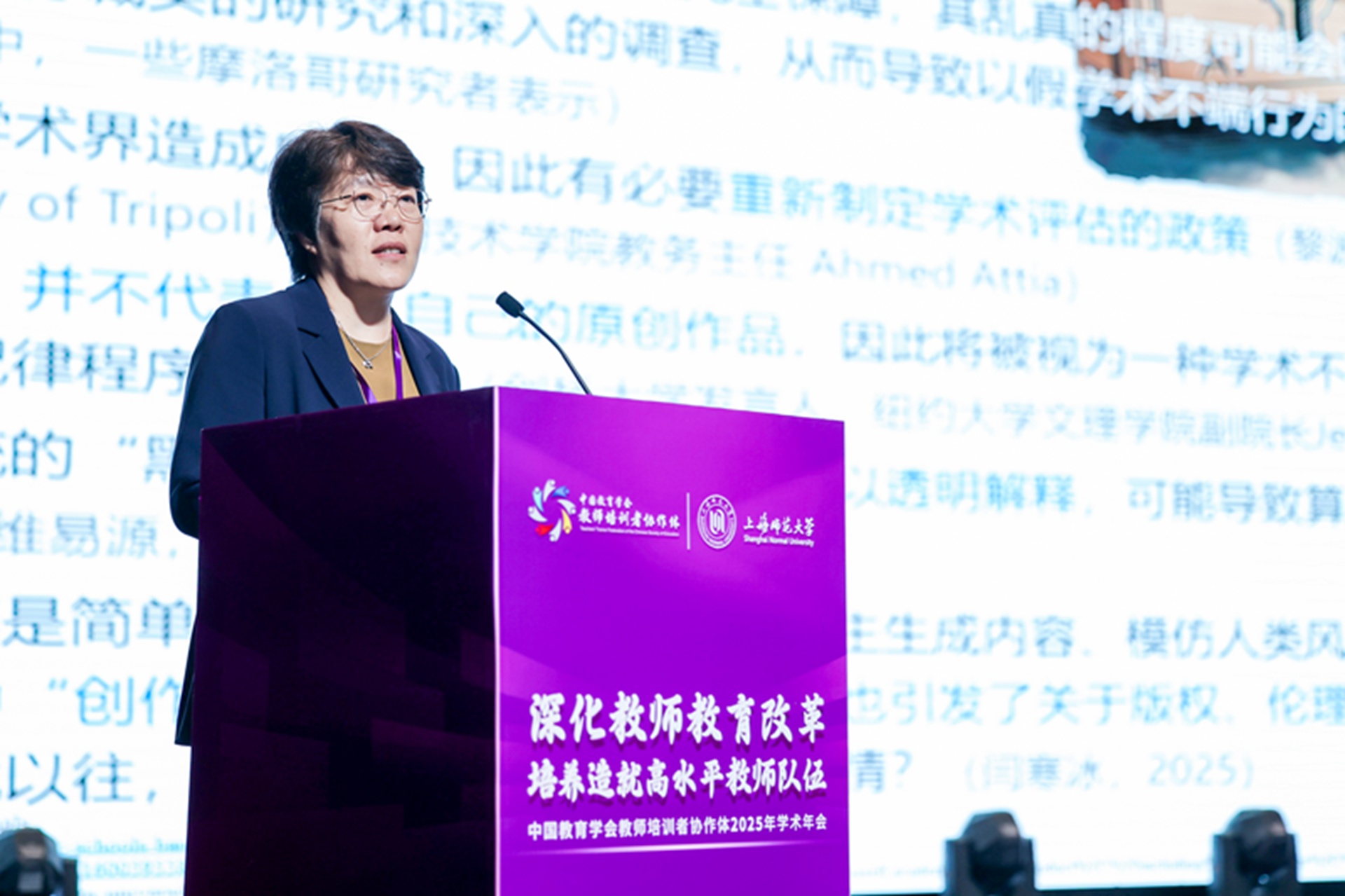 华东师范大学教师发展学院院长闫寒冰教授作“学习革命,从教师培训开始——迈向AI时代的育人新范式”主旨报告。她指出以ChatGPT为代表的生成式AI为教师培训打开“大规模因材施教”窗口的同时,也带来学术伦理、思维退化等“双刃剑”风险。她提出“素养导向、精准研训”五大实施路径:用思考模型重构课程内容,以“人机共教”重塑面授形态,借“智能导师”支持实践迁移,依托AI开展真实情境测评,并以伴随式反思破解算法幻觉,推动教师从“工具使用者”跃升为“AI协同创新者”,率先实现学习革命,为智慧教育树立新范式。