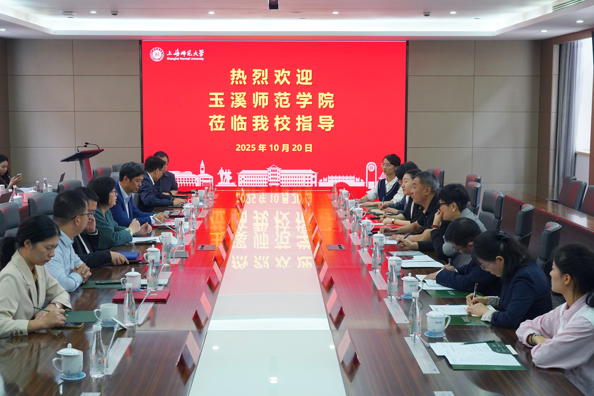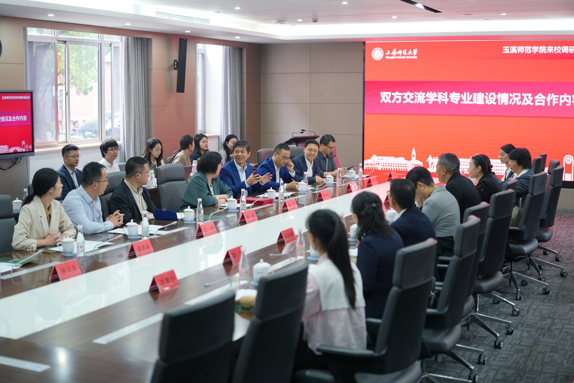 袁雯向远道而来的玉溪师范学院一行表示诚挚欢迎,期待以此次调研为契机,双方围绕小学教育一流专业建设开展深入交流,互学互鉴。上海师范大学教育学院院长黄海涛介绍了教育学院学科专业发展整体情况和小学教育专业建设成果,明确了双方合作框架,框架涵盖一流课程建设、学科内涵建设、师生互访交流等内容,并通过专家团队选派、线上线下教研、教师课题申报指导等举措,助力合作项目落地。玉溪师范学院通过视频展示了该校的办学特色与师范教育成果,玉溪师范学院教师教育学院院长殷素梅介绍了该校小学教育专业在云南省同类专业中的领先优势,同时表示期待通过此次合作精准提升学院在高水平教学科研成果、国家级项目立项、学生国家级比赛奖项等方面的潜力。