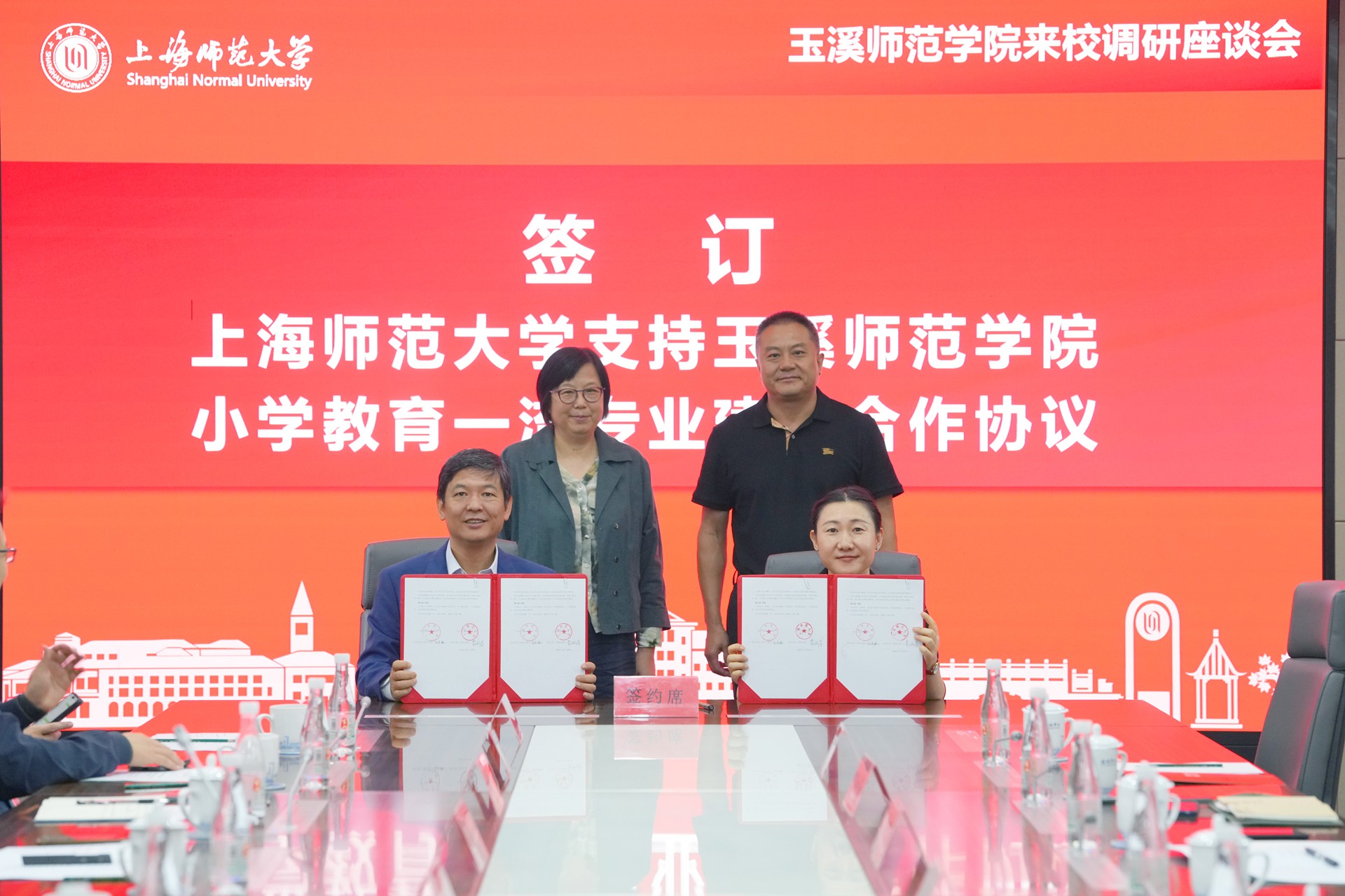 在双方校长的见证下,黄海涛与殷素梅共同签署了《上海师范大学支持玉溪师范学院小学教育一流专业建设合作协议》。