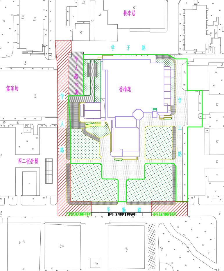 1.施工区域搭设临时围挡(详见附图绿色粗线围合区域)进行全封闭管理,非施工人员不得进入该区域,届时学工路(学子路~学勤路路段)将无法通行,敬请绕道。