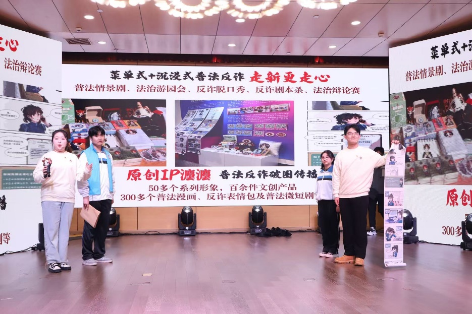 哲学与法政学院团委积极发挥学院专业特色,聚焦法治宣传教育的时代需求,采用菜单式+沉浸式的普法模式,开设普法微短剧、法治游园会、反诈脱口秀、反诈剧本杀、辩论赛等活动,以走新又走心的普法形式,让普法宣传入耳、入脑、入心。为进一步扩大团学工作的辐射力与影响力,哲学与法政学院团委还打造了原创灋灋IP,开发了50多个灋灋系列形象,制作了百余件文创产品,创作了300多个普法漫画、反诈表情包及普法微短剧等,用大众喜爱的方式实现普法的破圈传播,让法治精神在青年群体中生根发芽。