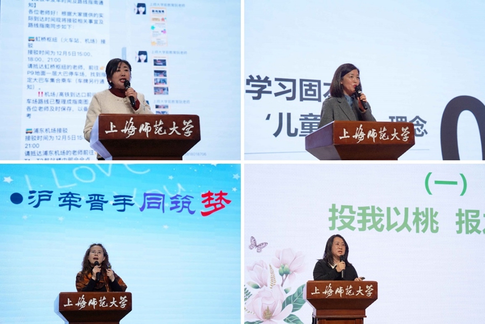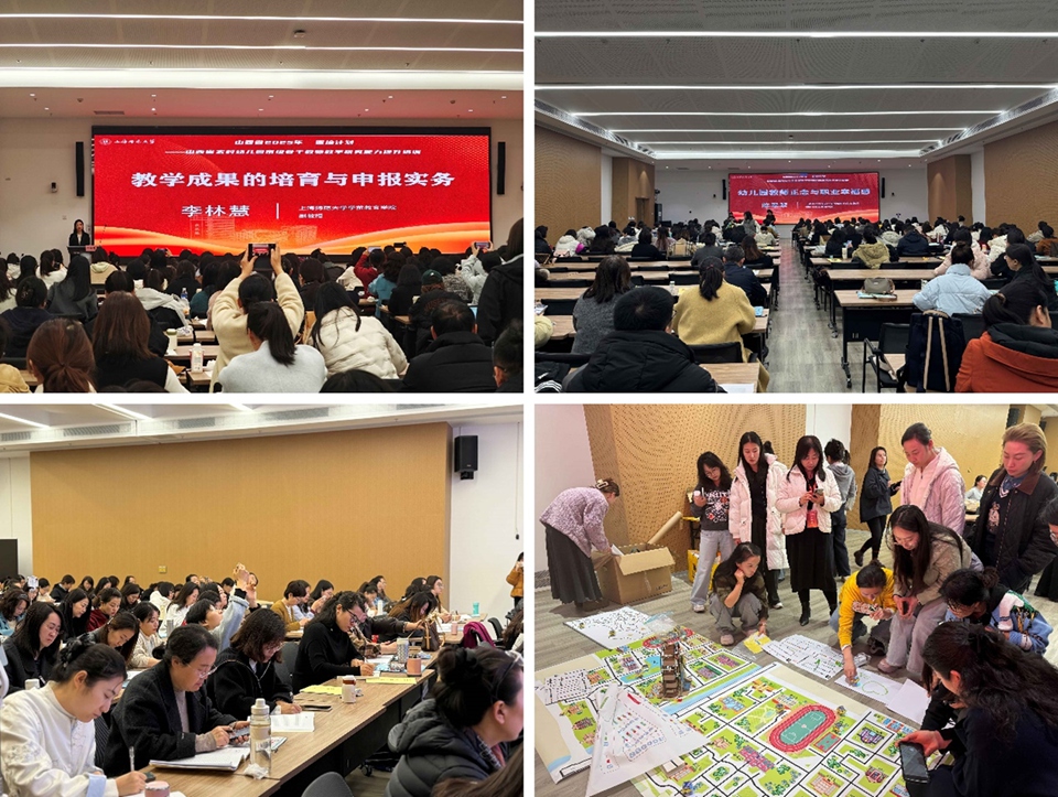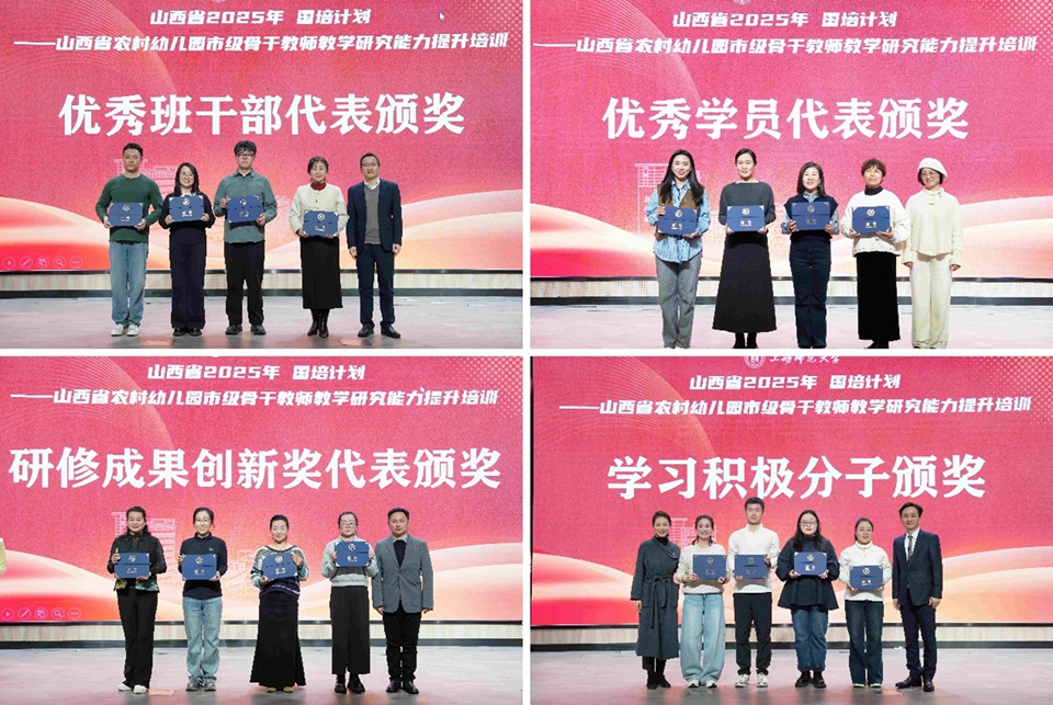 12月22日晚,2025年山西省“国培计划”农村幼儿园市级骨干教师教学研究能力提升培训项目结业仪式在教苑楼C座多功能厅举行。来自山西省各地的200名幼儿园骨干教师齐聚上海师大,共同见证为期20日的研修学习圆满收官。上海师范大学继续教育学院院长徐丰,学前教育学院党委书记杨成龙,项目首席专家、学前教育学院副院长李燕教授,学前教育学院党委副书记、副院长周泽龙,继续教育学院办公室主任徐立群,学前教育学院黄立安副教授、李雪梅副教授以及近20所参访名园园长出席仪式。
