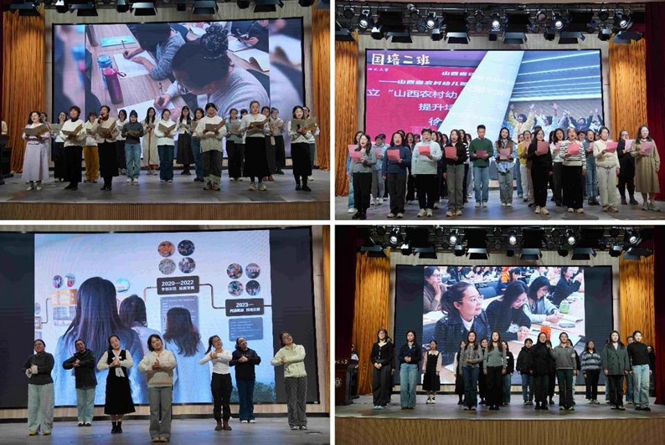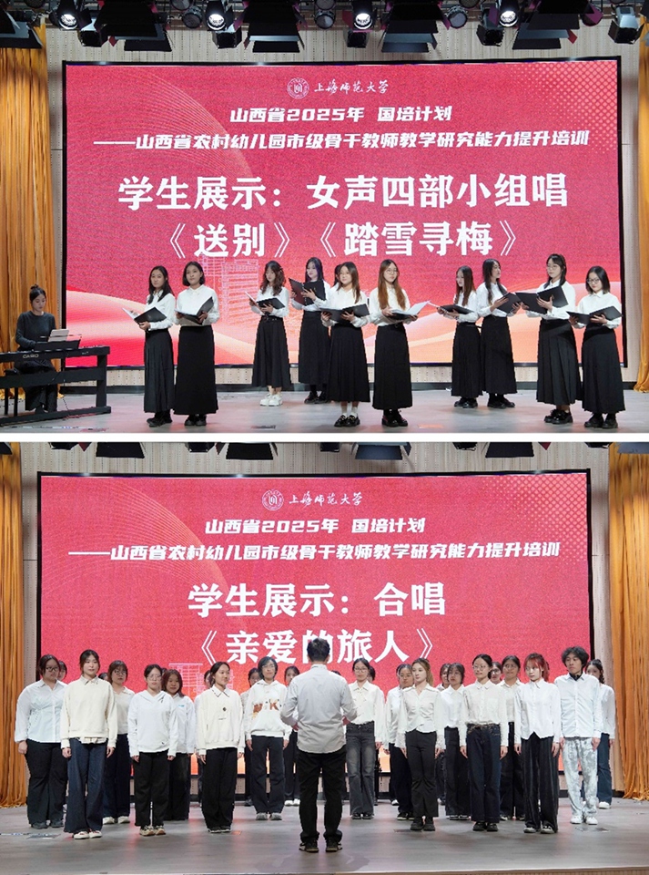 在成果展演环节,国培各班学员与学前教育学院师生联袂呈现了一场精彩纷呈的文艺演出,生动展现了国培学员与师大学前教育学院师生昂扬向上、融合创新的精神风貌。