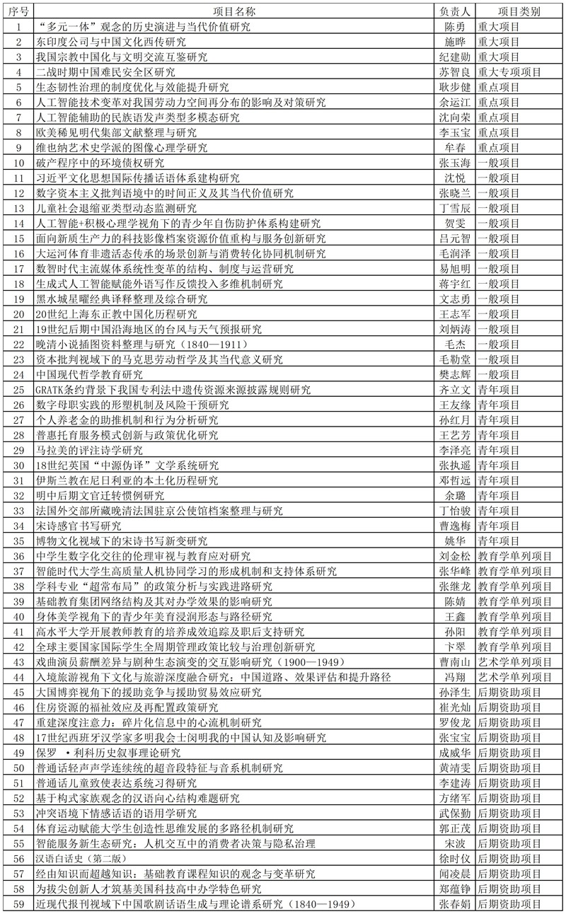 2025年国家社科基金各类项目结果于近日揭晓,我校共获批59项,再创学校国家社科基金项目立项数历史新高,彰显了我校哲学社会科学学科建设与科研创新能力的稳步提升。