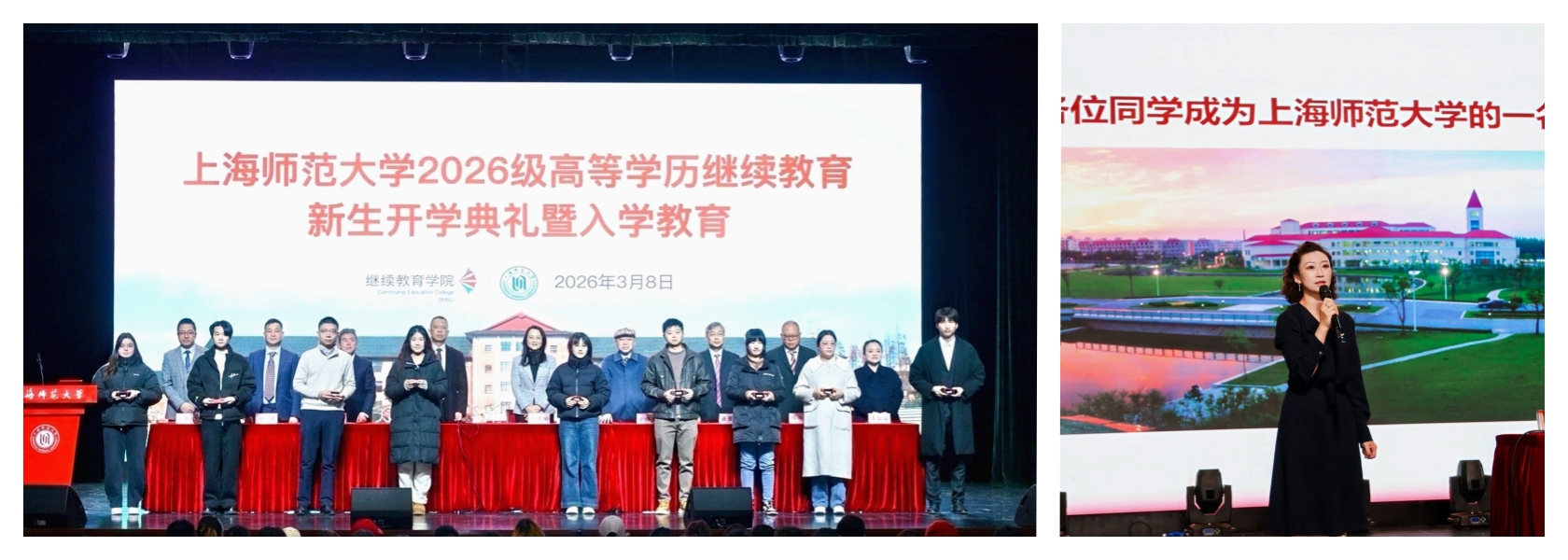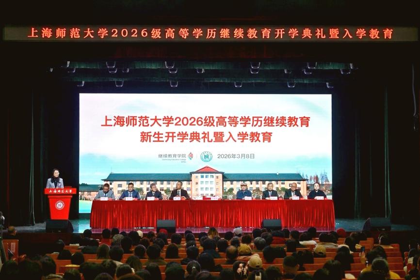3月8日,上海师范大学2026级高等学历继续教育新生开学典礼暨入学教育在音乐厅举行,线上同步直播。李国娟副校长、继续教育管理办公室主任盛爱军、继续教育学院党总支书记俞伟东、院长徐丰、副院长陈宇飞、校外教学点负责人出席活动,新生和家长、教务员、班主任等齐聚线上线下,典礼由徐丰主持。音乐厅座无虚席,8215人在线观看直播,点赞总计45270次。