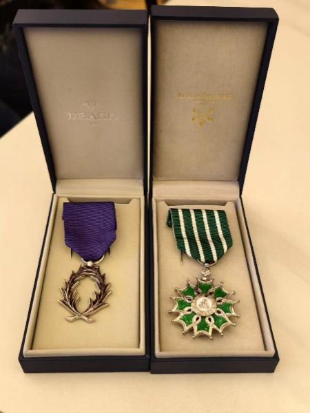 继2014年被授予法兰西艺术与文学骑士勋章的十二年之后,王方教授在电影学术研究与教学以及国际文化交流领域再度获得国际认可。(图中紫色徽章为2026年被授予的法兰西学术棕榈骑士勋章,绿色徽章为2014年被授予的法兰西艺术与文学骑士勋章。)